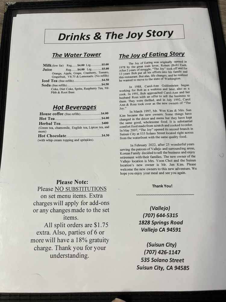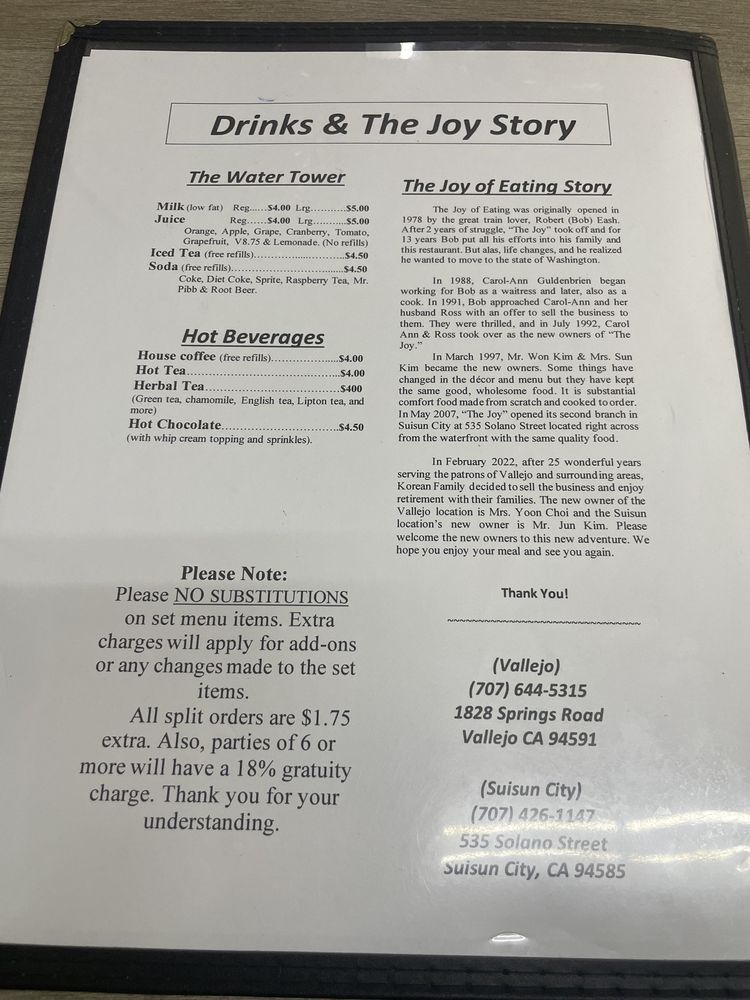 Joy of Eating Cafe in Vallejo, CA offers a delightful American breakfast and brunch experience. With a variety of menu options, including hearty breakfast marinated ribeye steak, crispy bacon waffles, and customizable omelets, this cafe caters to every palate. The cozy atmosphere and friendly staff create a welcoming dining environment, where customers can enjoy homemade bread and mouth-watering dishes like chicken fried steak. The cafe's commitment to quality and service shines through in each dish, making it a go-to spot for locals and visitors alike. Don't miss out on the opportunity to indulge in a delicious meal at Joy of Eating Cafe.